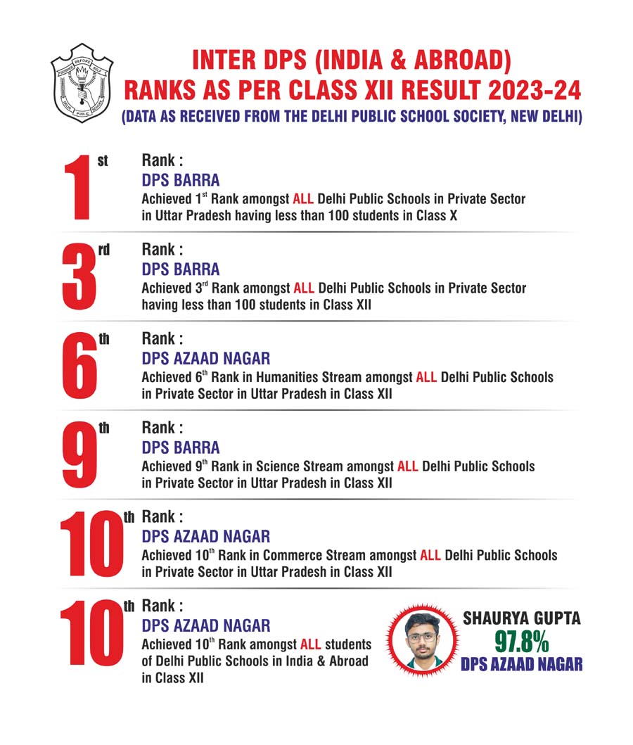The consistent presence of the students and schools of DPS Kanpur amongst the top ranks in the Inter DPS Rankings is a testimony to the consistently excellent board results of our schools. These academic accomplishments not only bring their alma mater at par with the top performing Delhi Public Schools across the globe but also set a benchmark for the batches to come.