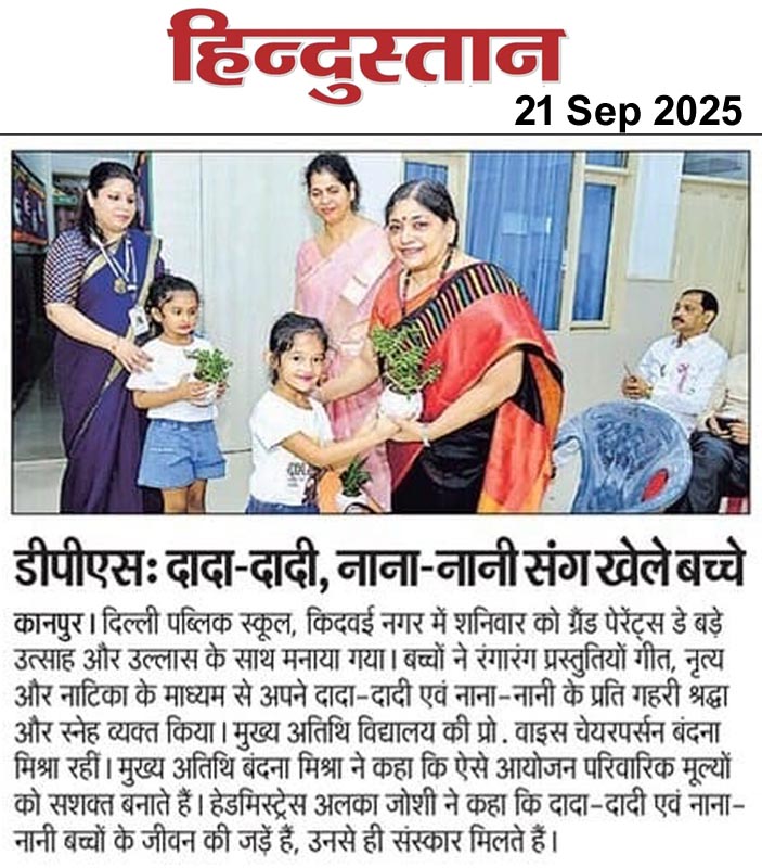 दिल्ली पब्लिक स्कूल, किदवई नगर में शनिवार को ग्रैंड पेरेंट्स डे बड़े उत्साह और उल्लास के साथ मनाया गया। बच्चों ने रंगारंग प्रस्तुतियों गीत, नृत्य और नाटिका के माध्यम से अपने दादा-दादी एवं नाना-नानी के प्रति गहरी श्रद्धा और स्नेह व्यक्त किया। मुख्य अतिथि विद्यालय की प्रो. वाइस चेयरपर्सन बंदना मिश्रा रहीं। मुख्य अतिथि बंदना मिश्रा ने कहा कि ऐसे आयोजन परिवारिक मूल्यों को सशक्त बनाते हैं। हेडमिस्ट्रेस अलका जोशी ने कहा कि दादा-दादी एवं नाना-नानी बच्चों के जीवन की जड़ें हैं, उनसे ही संस्कार मिलते हैं।