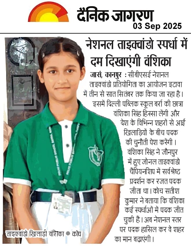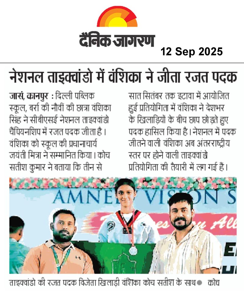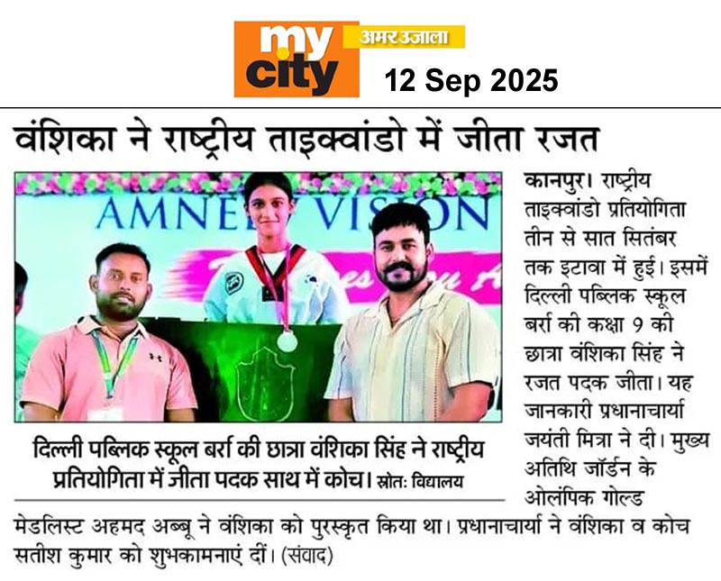 राष्ट्रीय ताइक्वांडो प्रतियोगिता तीन से सात सितंबर तक इटावा में हुई। इसमें दिल्ली पब्लिक स्कूल बर्रा की कक्षा 9 की छात्रा वंशिका सिंह ने रजत पदक जीता। यह जानकारी प्रधानाचार्या जयंती मित्रा ने दी। मुख्य अतिथि जॉर्डन के ओलंपिक गोल्ड मेडलिस्ट अहमद अब्बू ने वंशिका को पुरस्कृत किया था। प्रधानाचार्या ने वंशिका व कोच सतीश कुमार को शुभकामनाएं दीं।