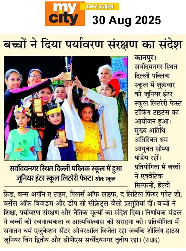 सर्वोदयनगर स्थित दिल्ली पब्लिक स्कूल में शुक्रवार को जूनियर इंटर स्कूल लिटरेरी फेस्ट टॉकिंग टाइटंस का आयोजन हुआ। मुख्य अतिथि अतिरिक्त श्रम आयुक्त सौम्या पांडेय रहीं। प्रतियोगिता में बच्चों ने एक्वेटिक सिम्फनी, हेल्दी फ्रेंड, वन्स अपॉन ए टाइम, पिलर्स ऑफ लाइफ, द लिटिल फिंगर पपेट शो, वर्सेस ऑफ विजडम और डीप सी सीक्रेट्स जैसी प्रस्तुतियां दीं। बच्चों ने शिक्षा, पर्यावरण संरक्षण और नैतिक मूल्यों का संदेश दिया। निर्णायक मंडल ने बच्चों की रचनात्मकता व आत्मविश्वास की सराहना की। प्रतियोगिता में सनातन धर्म एजुकेशन सेंटर ओवरऑल विजेता रहा जबकि शीलिंग हाउस जूनियर विंग द्वितीय और डीपीएस सर्वोदयनगर तृतीय रहा।