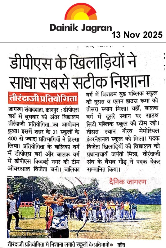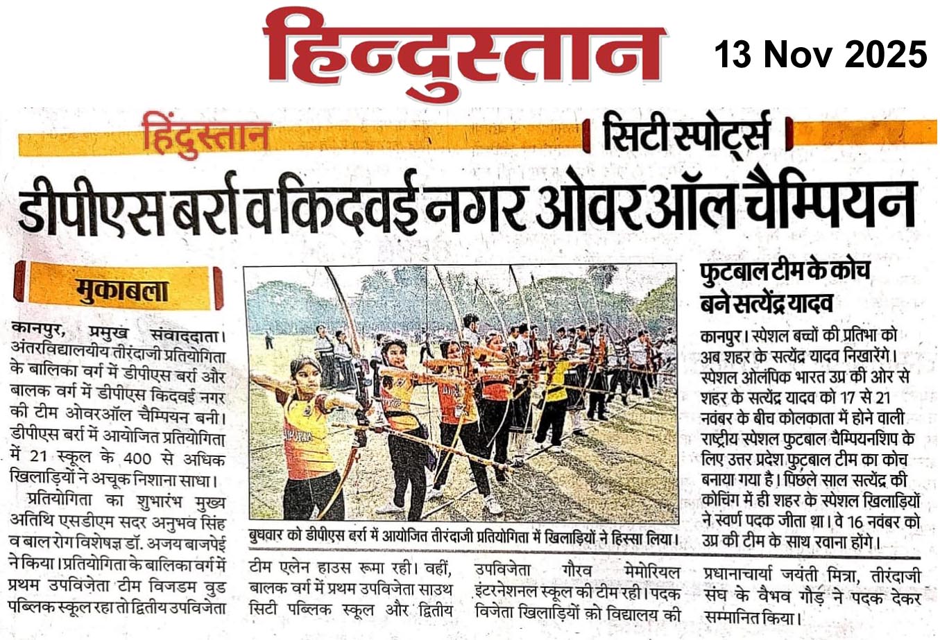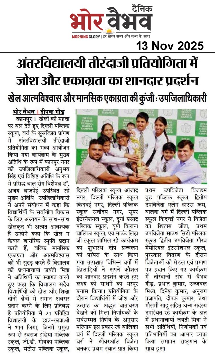 खेलों की महत्ता पर बल देते हुए दिल्ली पब्लिक स्कूल, बर्रा के सुसज्जित प्रांगण में अंतरविद्यालयी तीरंदाजी प्रतियोगिता का भव्य आयोजन किया गया कार्यक्रम के मुख्य अतिथि के रूप में कानपुर नगर की उपजिलाधिकारी अनुभव सिंह एवं विशिष्ट अतिथि के रूप में प्रसिद्ध बाल रोग विशेषज्ञ डॉ. अजय बाजपेई उपस्थित रहे मुख्य अतिथि उपजिलाधिकारी ने अपने संबोधन में कहा कि विद्यार्थियों के सर्वांगीण विकास के लिए अध्ययन के साथ-साथ खेलकूद भी अत्यंत आवश्यक हैं उन्होंने कहा कि खेल न केवल शारीरिक स्फूर्ति प्रदान करते हैं, बल्कि मानसिक एकाग्रता और आत्मविश्वास को भी सुरढ़ करते हैं विद्यालय की प्रधानाचार्या जयंती मित्रा ने अतिथियों का स्वागत करते हुए कहा कि विद्यालय सदैव विद्यार्थियों को खेल और शिक्षा दोनों क्षेत्रों में समान अवसर प्रदान करने के लिए प्रतिबद्ध है प्रतियोगिता में 21 प्रतिष्ठित विद्यालयों के छात्र-छात्राओं ने भाग लिया, जिनमें प्रमुख रूप से स्वराज इंडिया पब्लिक स्कूल, जी.डी. गोयंका पब्लिक स्कूल, मंटोरा पब्लिक स्कूल, दिल्ली पब्लिक स्कूल आजाद नगर, दिल्ली पब्लिक स्कूल किदवई नगर, दिल्ली पब्लिक स्कूल सर्वोदय नगर, सुपर इंटरनेशनल स्कूल, दुर्गा प्रसाद पब्लिक स्कूल, यूपी किराना बालिका स्कूल, एवं माउंट लिट्टा जी स्कूल शामिल रहे कार्यक्रम का शुभारंभ दीप प्रज्वलन की परंपरा के साथ किया गया तत्पश्चात विभिन्न वर्गों में खिलाड़ियों ने अपने कौशल का शानदार प्रदर्शन करते हुए लक्ष्य को साधने का भरपूर प्रयास किया। प्रतियोगिता के दौरान विद्यार्थियों में जोश और उत्साह का अद्भुत बातावरण देखने को मिला निर्णायकों के सर्वसम्मत निर्णय के अनुसार परिणाम इस प्रकार रहे बालिका वर्ग में दिल्ली पब्लिक स्कूल बर्रा ने ओवरऑल विजेता बनकर प्रथम स्थान प्राप्त किया प्रथम उपविजेता विजडम बुड पब्लिक स्कूल, द्वितीय उपविजेता एलेन हाउस रूम, बालक वर्ग में दिल्ली पब्लिक स्कूल किदवई नगर ने विजेता का खिताब जीता, प्रथम उपविजेता साउथ सिटी पब्लिक स्कूल द्वितीय उपविजेता गौरव मेमोरियल इंटरनेशनल स्कूल, पुरस्कार वितरण के दौरान विजेताओं को मेडल एवं प्रमाण पत्र प्रदान किए गए कार्यक्रम में तीरंदाजी संघ से वैभव गौड़, प्रभात कुमार, उज्जवल मिश्रा, दिनेश कुमार, अनुराग प्रजापति, दीपक कुमार, तथा मौसमी साहू सहित अन्य सदस्य उपस्थित रहे कार्यक्रम के अंत में प्रधानाचार्या जयंती मित्रा ने सभी अतिथियों, निर्णायकों एवं प्रतिभागियों का आभार व्यक्त किया समापन राष्ट्रगान के साथ हुआ